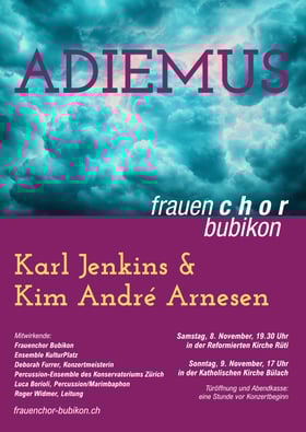 Mitwirkende: Frauenchor Bubikon, Ensemble KulturPlatz, Deborah Furrer – Konzertmeisterin, Percussion-Ensemble des Konservatoriums Zürich, Luca Borioli – Percussion/Marimbaphon, Roger Widmer – Leitung