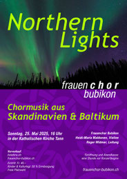 Mit ihrem Konzert «Northern Lights» am 25. Mai 2025 entführte der Frauenchor Bubikon unter der Leitung von Roger Widmer das Publikum in der katholischen Kirche Tann in die geheimnisvollen Klangwelten Skandinaviens und des Baltikums. Ein fein abgestimmtes a-cappella-Programm mit Werken von Ola Gjeilo, Veljo Tormis und Hugo Alfvén spannte den Bogen von stiller Melancholie bis zu lebendiger nordischer Volksmusik.